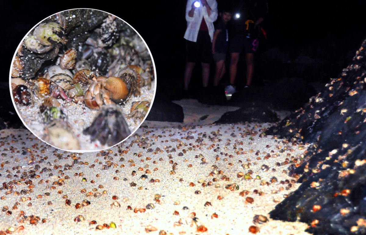 1日午後10時すぎの同ポイント。すでにヤドカリたちの大群が長さ約50㍍にわたって岩と砂浜を覆っていた。その一部は、宿貝と体の間に抱えたままふ化させたゾエア幼生を、礁湖の海水に浸かって体を揺らしながら放出。赤紫色をしたボウフラ状の幼生たちが、体をくねらせて泳ぐ姿が肉眼でも確認できる。
