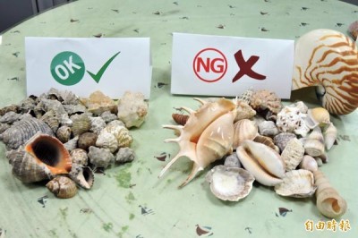 保育志工呼籲民眾將食用後的螺類洗淨供寄居蟹居住。圖左是可被寄居蟹入住的貝殼,圖右則是寄居蟹無法使用的。(本報資料照)