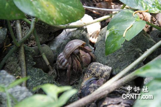 中評社記者來到黃淑凰親手打造的寄居蟹快樂天堂。在一片樹林中,數十只寄居蟹藏在落葉和草叢之間,如果安靜下來,還能聽到寄居蟹們發出的“窸窸窣窣”的聲音。在小樹林前,擺放著一片白色貝殼,等待夜幕降臨時,寄居蟹的到來。