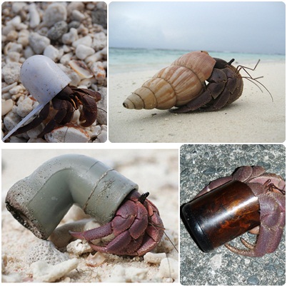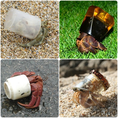 寄居蟹找不到殼可以換的時候,只好棲身各式垃圾之中。 取自網路