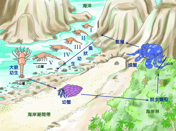 椰子蟹的一生,因為生殖階段都在海洋中,所以目前在缺乏資訊的情況下無法人工繁殖。 取自網路