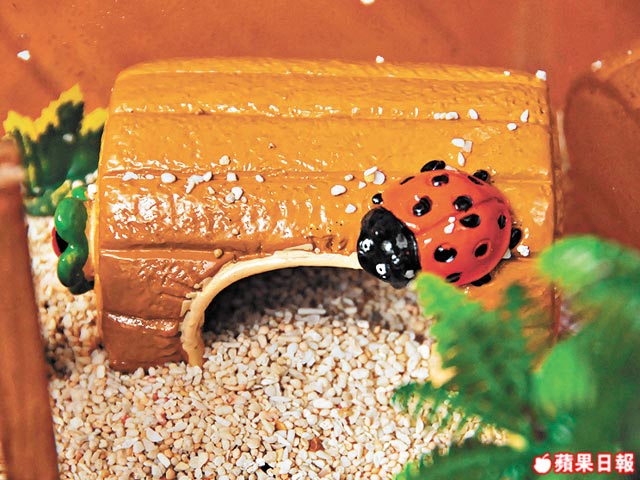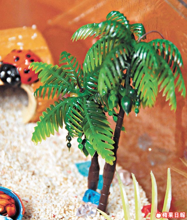 養寄居蟹最大樂趣是可以設計部屋,由牠背的殼至整個大缸,也可盡展主人創意,市面上可輕易買到粉飾蟹殼的顏料、玩具屋、梯子、食物盤和洗澡缸。雖然拆禮物日已過,聖誕部屋已過時,但新年將至,也是時候替寄居蟹置一間新大屋、添一點燈飾。「自養蟹熱潮以來,不少人想人工繁殖寄居蟹,好讓蟹部屋可以三代同堂,但每次出生的蟹由於體形太小,沒有殼換就夭折,加上水酸鹼值和鹽度調校得不好,所以暫未有成功過案。」