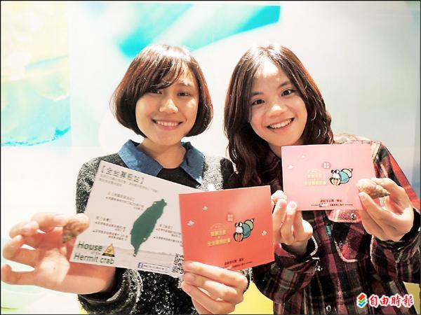 交通大學大傳系大四學生黃莉(左)及蘇品勻(右)發起救救海灘難民活動,希望為寄居蟹募殼,獲得回響。(記者洪美秀攝)