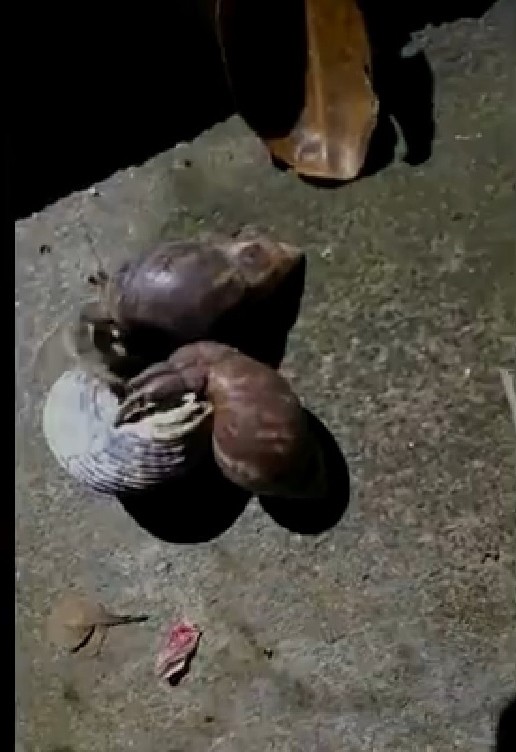 兩隻寄居蟹搶一個殼的情況,讓小野柳管理站人員發起「給寄居蟹一個家」活動。(翻攝自「夜訪小野柳」臉書)