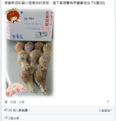 新店劉小姐寄的貝殼,讓小野柳管理站人員興奮留言:這下子寄居蟹有帝寶豪宅可換了!(翻攝自「夜訪小野柳」臉書)
