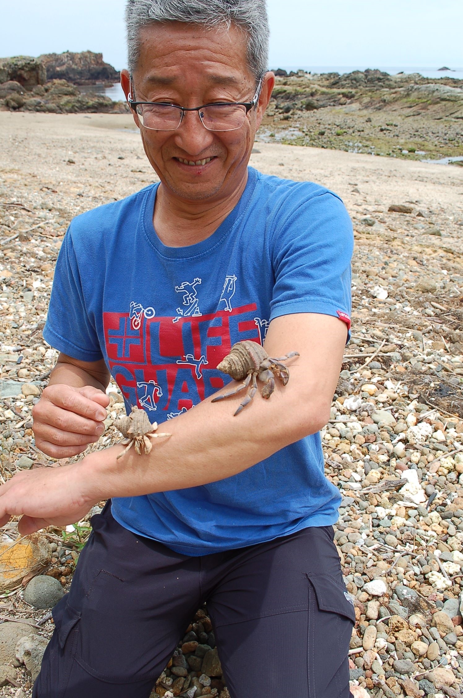 下田の海岸に生息するオカヤドカリを手にする小沢さん