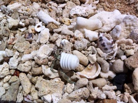 当你在垦丁沙滩看到背著宝特瓶盖奶粉勺、玻璃瓶、水龙头寄居蟹因为贝壳越来越少垃圾越来越多造成寄居蟹「一贝难求」(记者郭孟聪摄)
