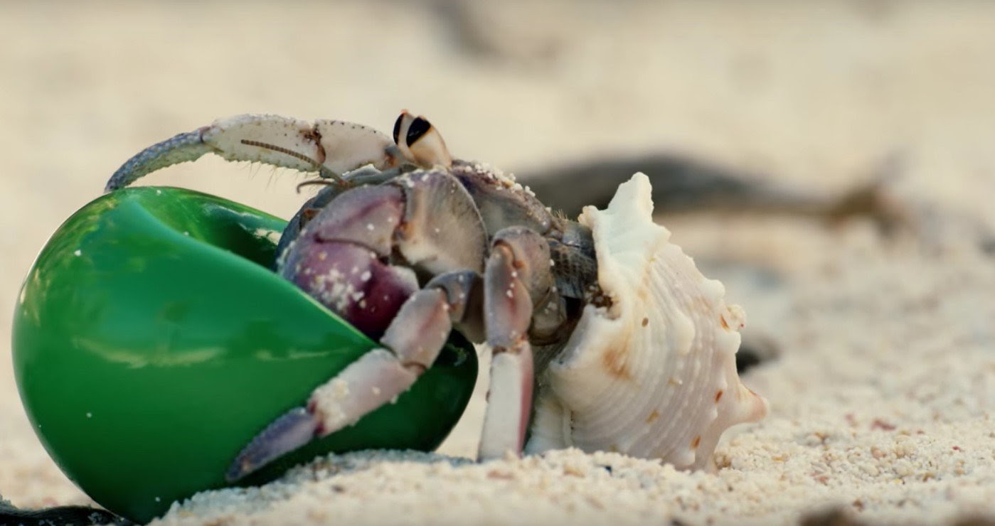 在許多人隨手撿起沙灘上的貝殼的同時,也遺留下許多不應該屬於大自然的垃圾,每一個人都覺得一件無所謂的小事,卻引起了寄居蟹開始揹起垃圾的怪異現象。越來越多人注意到,海邊的寄居蟹因為找不到殼替換,開始縮在塑膠殼蓋、瓶蓋、燈泡等垃圾中。人們對於海洋生態的破壞,造成了寄居蟹的無家可歸,也同時讓寄居蟹失去的抵抗天敵的能力,暴露在危險之中,日日都在面臨生存危機。