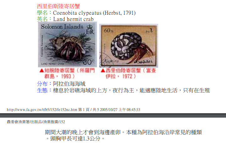 1. Coenobita pseudorugosus, 論文是有, 但說到底仍然未有很詳細的資料, 如活體的特徵和彩圖是沒有. 現在只知道印尼有此品種.