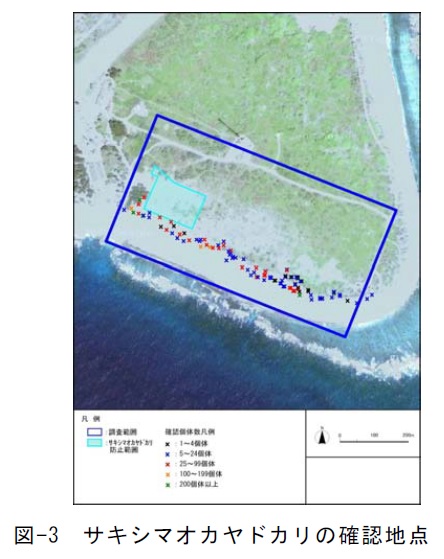 原文:「注目種調査の結果、サキシマオカヤドカリについては、調査地南側の海岸周辺で多数確認された(図-3)。モクマオウ林内のリュウゼツランの根元などでは日中多数の個体が休息しているのが観察された。このことから、サキシマオカヤドカリは年を通して海岸一帯に広く分布していると考えれらる」