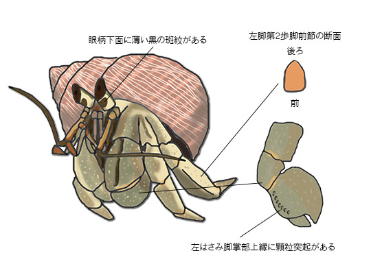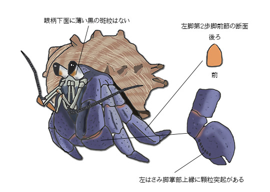 在此島, 最初作者認為那些陸寄居蟹品種都是灰白陸寄居蟹, 但經過調查後, 發覺那些全都是紫陸寄居蟹來的. 分別此兩種品種主要是看灰白陸寄居蟹眼柄下有簿簿的黑斑紋, 而紫陸寄居蟹並沒有此黑班紋, 此特徵從小到大都不會改變.