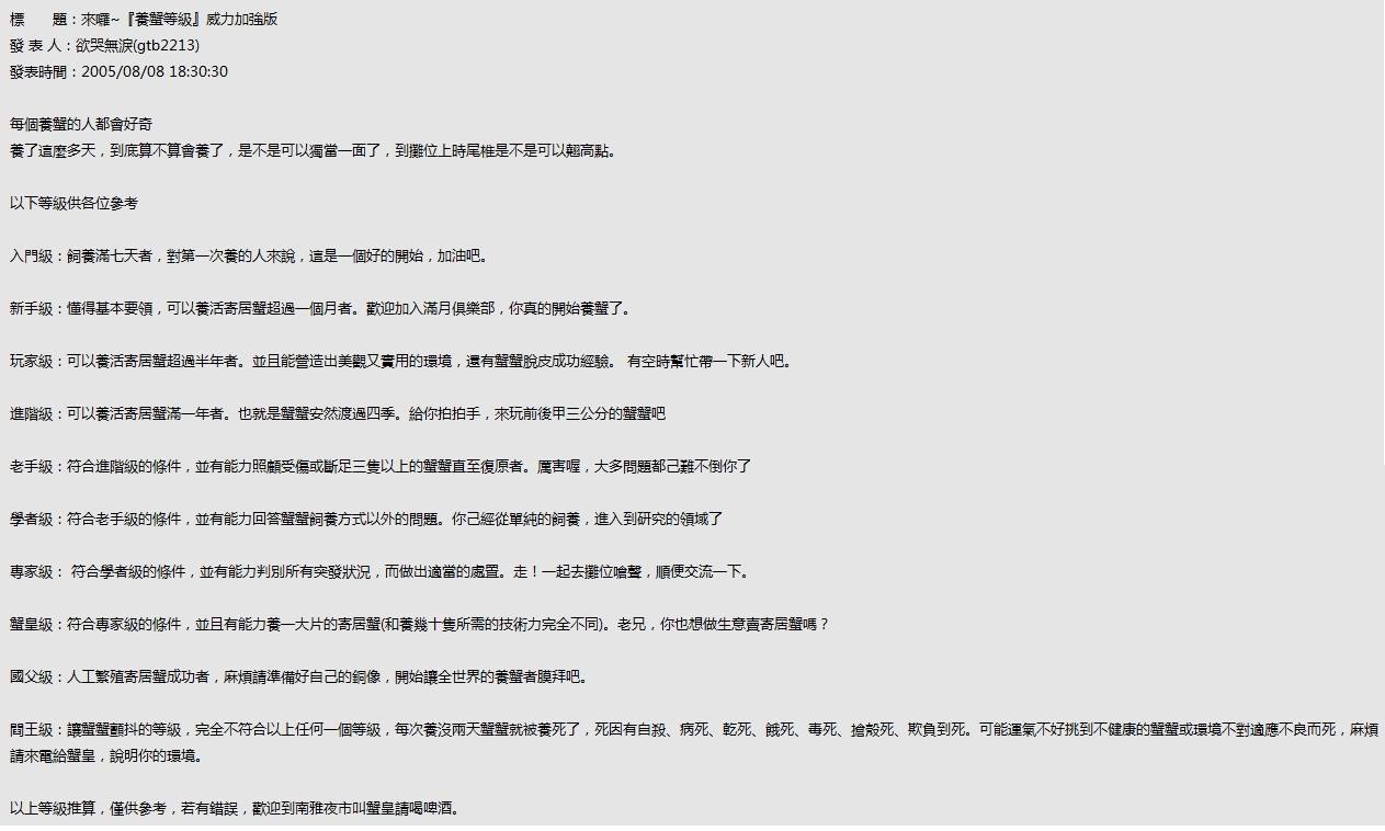 跟大家來分享以前台灣蟹友喜歡把養蟹要分等級(看圖), 我的級别當然是狗級(不是9級, 真的是狗), 因為業者眼中, 我就是飼養缸不夠大, 業者的口頭禪:「台灣的飼養者隨便做做也比香港狗的缸要大」, 哈哈, 香港居住環境小是事實, 我的飼養缸的確不是很大, 但也可以養上十年, 比起十幾年來只懂打嘴炮, 拿沙上脫皮照片來炫耀的業者, 都不說很差吧.