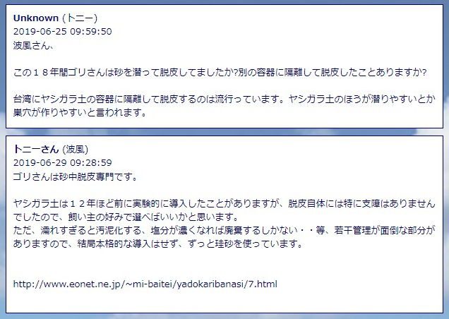 答案是ゴリさん是沙中脫皮的專家(沒有被隔離過, 因為飼養者一向主張不隔離脫皮). 飼養者12年前曾使用過椰土來做底材脫皮, 不過沒有個體在椰土脫皮, 最後還是用珊瑚沙(飼養者所說的珪沙)來做底材.