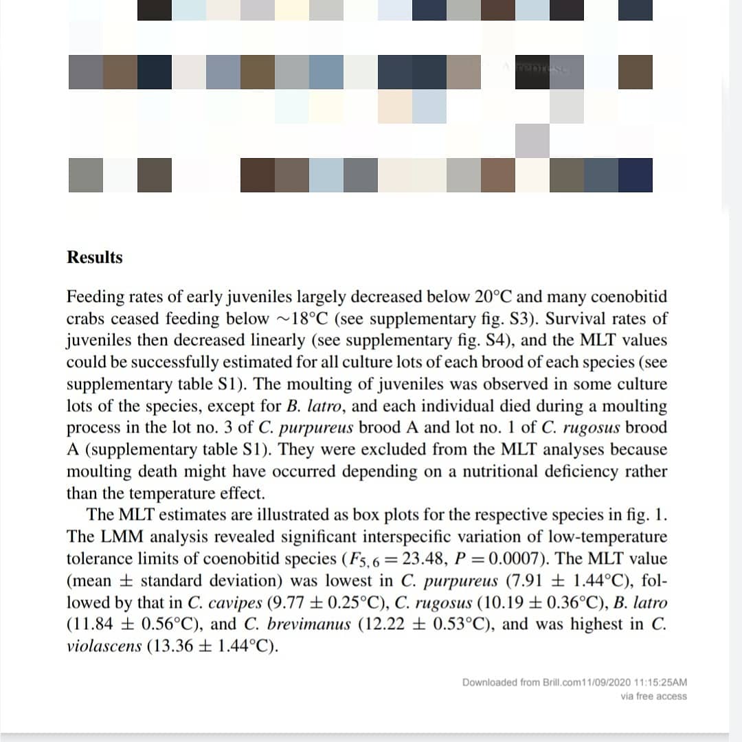 Picture ① Temperature reference for B.latro, C.brevimanus, C.cavipes, C.purpureus, C.rugosus and C.violascens from article <Low-temperature tolerance of early juveniles of sixterrestrial hermit crab species>
