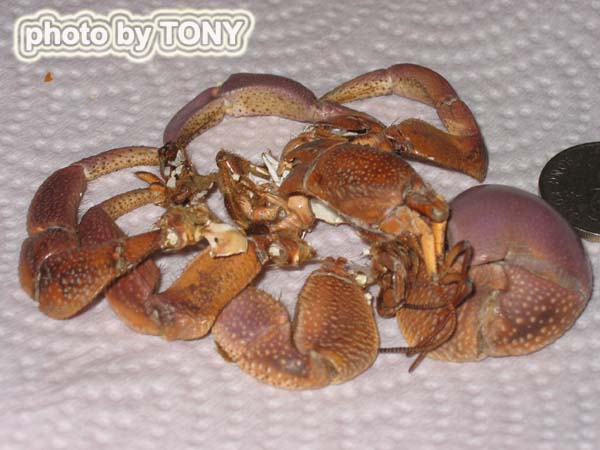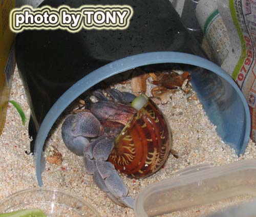 天氣忽然轉冷, 前幾天白天才有19.20度, 前天晚上起溫度只有10度, 急急把熱毯開啟, 並在飼養缸的頂部蓋上毛巾, 替牠們保暖. 全部陸寄居蟹也躲起來, 不太活動. 反而剛脫殼後的短腕陸寄居蟹, 在洞穴口附近爬來爬去. 牠還沒有吃掉脫下來的舊殼., 而且身體還未完全硬化起來, 很明顯牠的體色變淺了很多. 由買回來很鮮艷的紫色, 變成淡淡的粉藍色, 只有身體的後甲部分留有紫色的色素. 這很大可能和牠在大自然食的東西與我給牠食的東西不同, 而造成體色的強烈變化. 不管體色變成如何, 這次是首隻飼養的短腕陸寄居蟹成功脫殼, 實在值得高興.