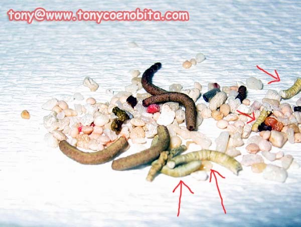 如果確實知道不同品種的陸寄居蟹在野外吃的食物是甚麼, 對我們有很大幫助, 因為從排抴物知道不同品種吃甚麼食物, 而從食物裏大約可知道不同品種所需要吸收甚麼. 我們現在餵飼的食物都是以多元代為主, 以"有多沒少"為基本, 希望能給牠們所需.