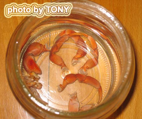 其實在小狗離開前的幾天 , 家裏的深紫陸也突然死亡了. 不知甚麼原因, 之前還看到牠進食, 但拿出來時看到腹部是瘦瘦的, 好像餓了很久的樣子. 可能大家覺得我也會把牠們養死, 但生命就是這樣, 十分脆弱, 昨天還活著, 今天可以離去, 沒有甚麼可以做到了, 唯有把牠製作成標本, 讓牠的軀殼繼續留存下來. 但十分奇怪的, 把深紫色的甲殼放在溶液分解後, 牠的甲殼顏色逐漸脫下, 變成橙色的顏色. 有說深紫陸的幼體是橙色的(下圖), 長大後身體的紫色才慢慢出現, 這可能是真的......(還是email 給蟹皇問問).