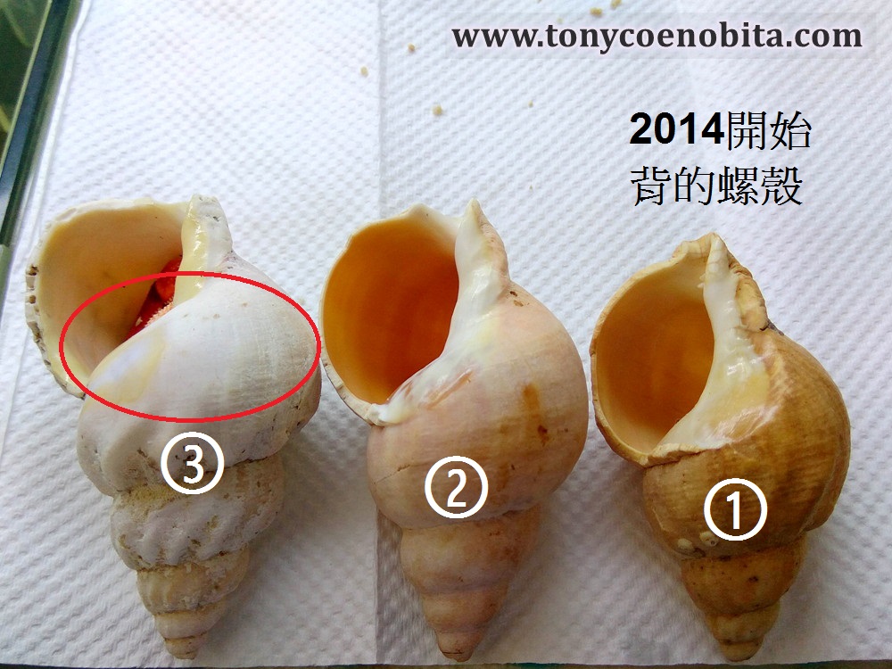 剛剛我家飼養近9年的橙紅陸寄居蟹便出現了一個例子. 1號螺殼背了3年幾, 2號螺殼放了1年幾也沒有更換.