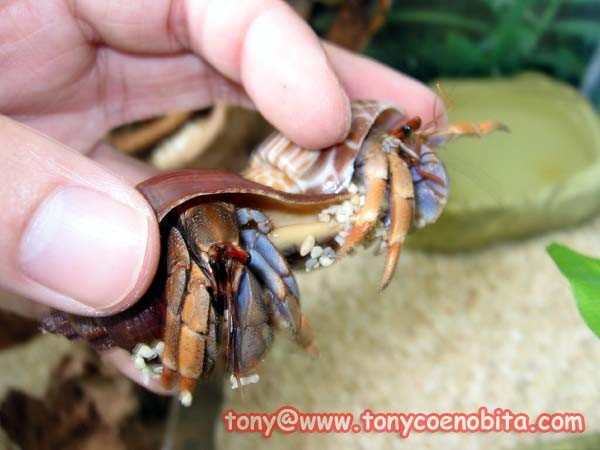 其實陸寄居蟹更換螺殼的次數時間, 並非業者, 報章雜誌所說的"每年會換殼兩次(這是噱頭吧)", 牠們更換螺殼是沒有一定時間的, 有些個體背著同一螺殼超過2年也不會更換, 這表示牠背著的螺殼還適合, 根本不需更換, 我們也不能強迫牠們更換.