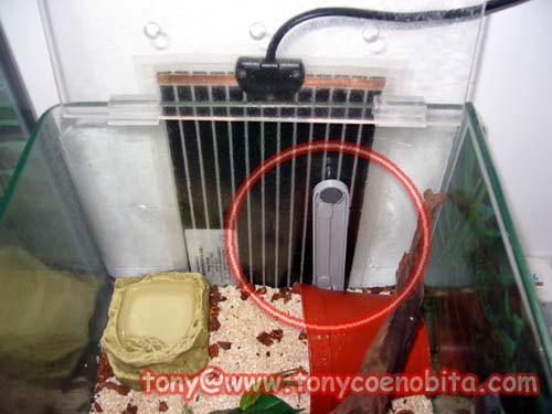 開啟熱後,可把溫度計放在貼有熱毯的缸壁(如下圖),測試那邊的溫度,以防止過熱。