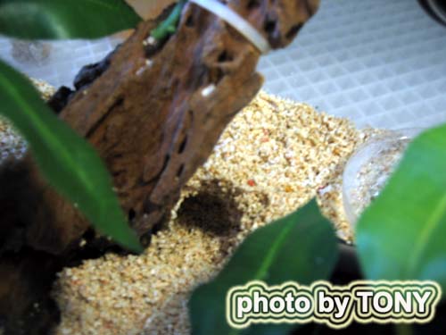 因為在脫殼前牠把沙弄濕, 所以沙子便會黏起來,當牠從沙鑽出來時, 便會形成一個洞穴. 之後在角落的地方發現了牠. 體色稍為深了多少. 很高興又一次脫殼成功.