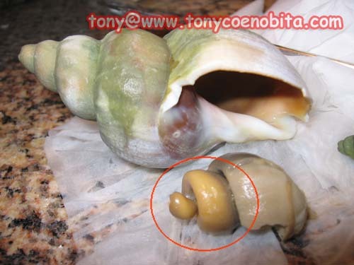 因為前半部分已被我挖走, 但後半分還殘留在螺殼內部, 從螺殼口往內看也不會看到. 只要把螺殼搖搖, 便會聽到內裏還有東西.