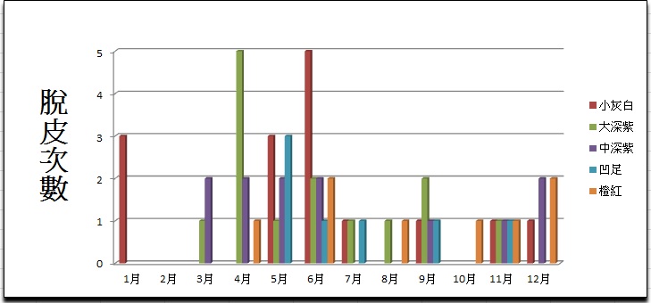 所以這次再整理多一次, 從2006-2014年這8年來5隻個體的脫皮完成日期綜合出來的數據, 發現春夏季才是旺季.