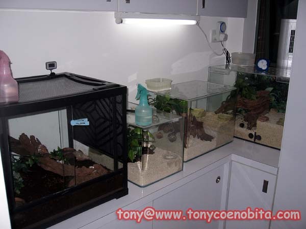 冬季場景(缸內的佈置稍為改動了) - 會開啟熱毯(會跟據不同氣溫利用報紙來調節), 在飼養缸上蓋上毛巾及一盆水 (房間放了1個溫濕度計, 1個電子溫度計以測量房間溫濕度)