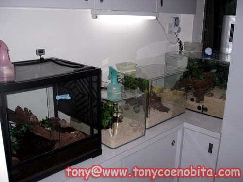 共有4個飼養缸, 還裝了UVB燈(Repti Glo 2.0)連時間控制器, 風扇等等.
