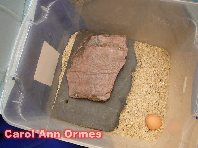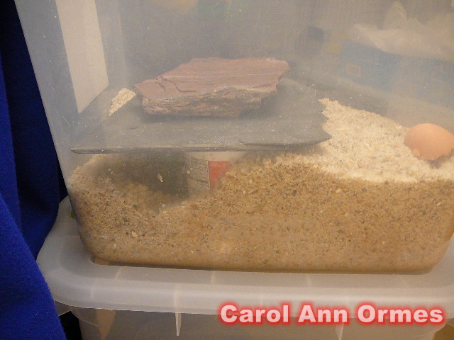 隔離缸內有2塊石板(底有兩個乳酪罐支撐著), 他就在石板下挖掘. Carol會用兩塊藍色布讓隔離缸保持黑暗, 讓他在黑暗的情況下脫皮.