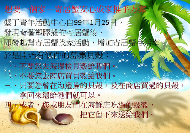 和人一樣,我也需要個好家!把空殼寄給我;不要再撿拾、買賣貝殼了!好嗎?瑭芯製