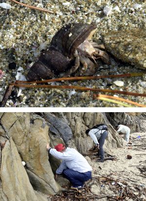 【写真説明】[上]牟岐町で発見された国天然記念物のムラサキオカヤドカリ=牟岐大島 [下]ムラサキオカヤドカリを探すカイフネイチャーネットワーク会員や県立博物館の学芸員ら=牟岐町沖の牟岐大島
