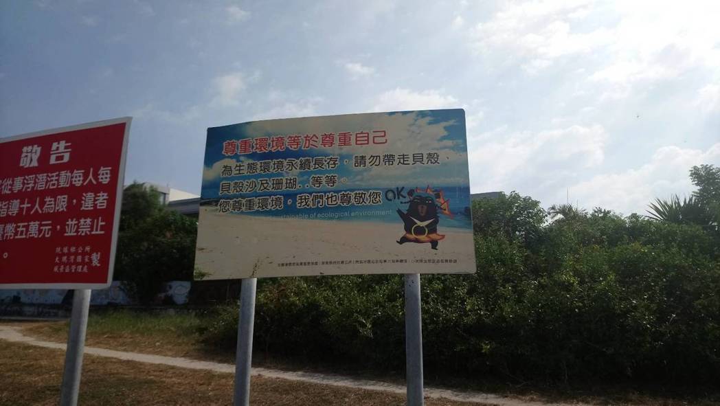鵬管處琉球管理站在島上風景區有插上告示牌宣導「尊重環境,請勿帶走貝殼、貝殼沙及珊瑚」,藉此呼籲遊客發揮公德心。記者蔣繼平/攝影
