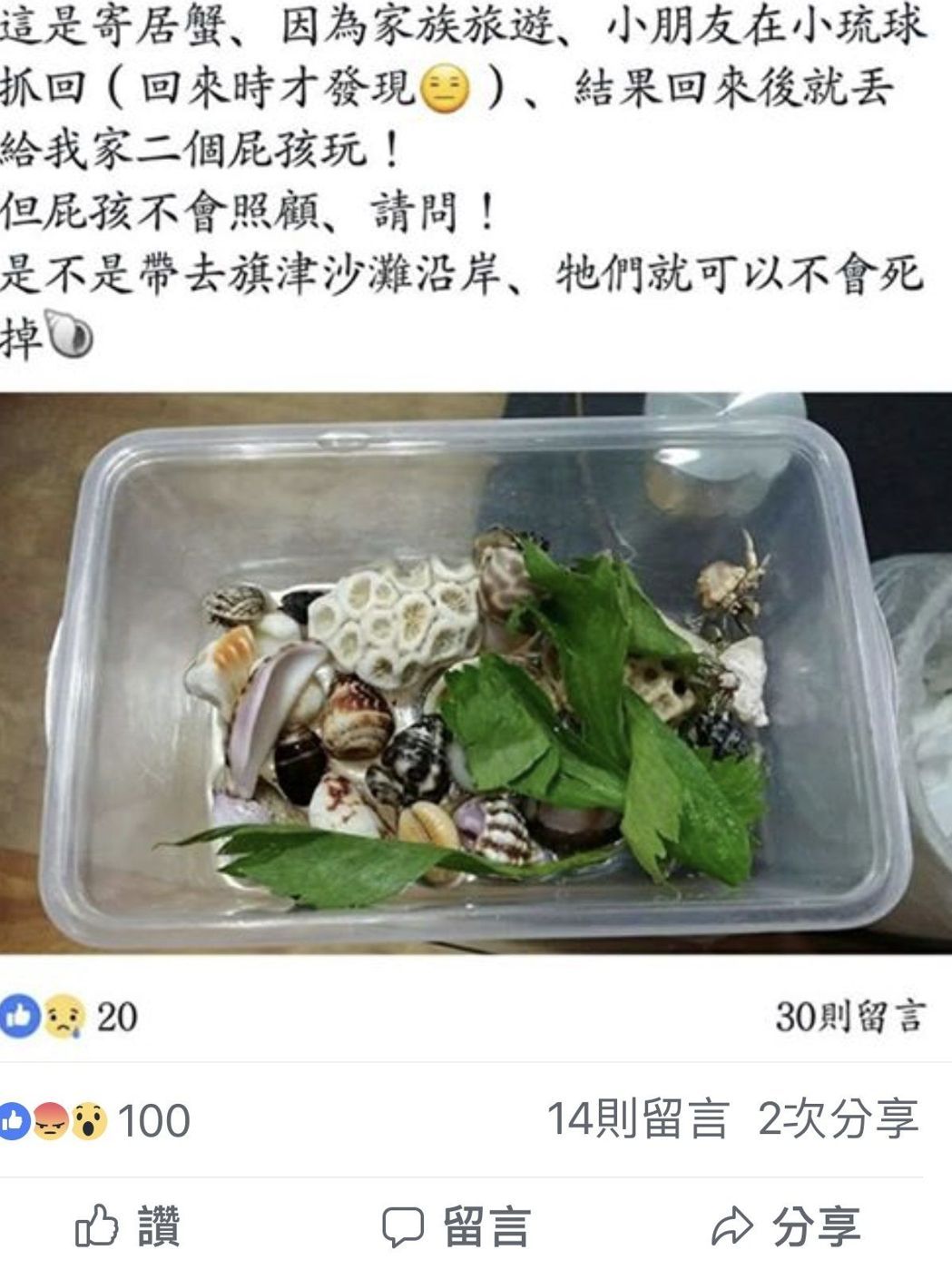 有高雄遊客帶回小琉球寄居蟹但不會養想野放,上網詢問後引發熱議。記者蔣繼平/翻攝自臉書社團小琉球聯盟
