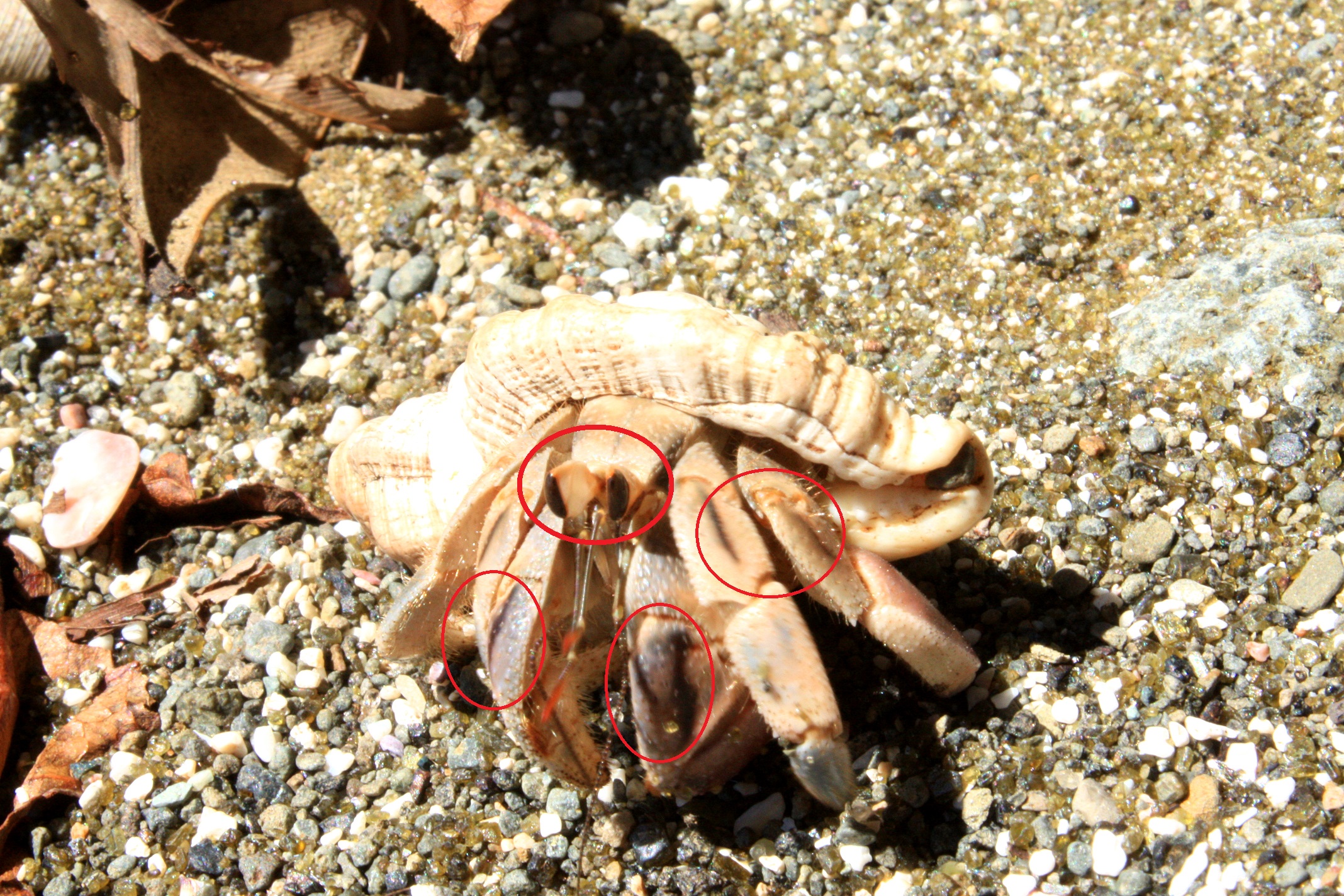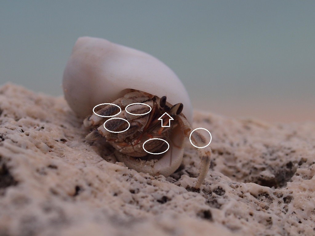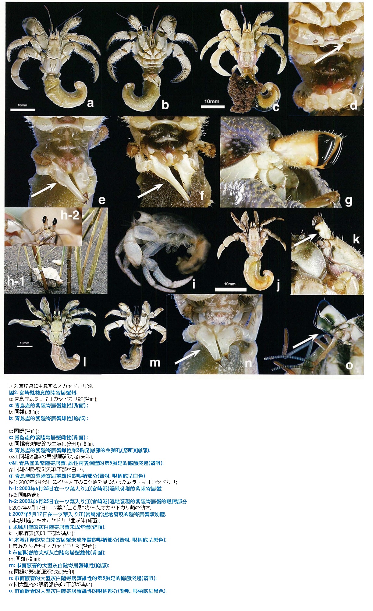 跟據以上, 針對眼柄底部的色斑, 胸足的指節, 前節, 腕節的斑紋和雄性個體的第5胸足的底節突起的對稱形狀差異, 己經把在宮崎縣採集到的陸寄居蟹類分別出來.