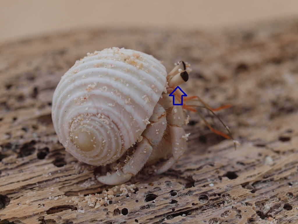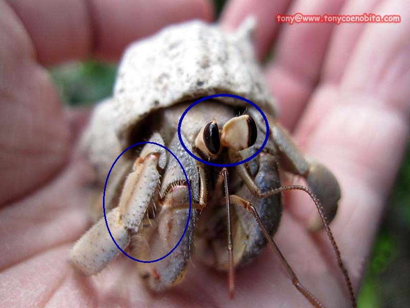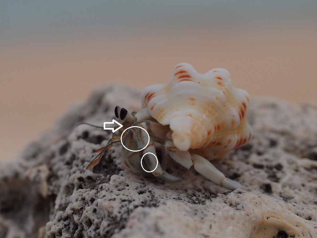 灰白陸寄居蟹幼體, 眼柄底部黑色, 胸足的指節, 前節, 腕節著有斑紋: