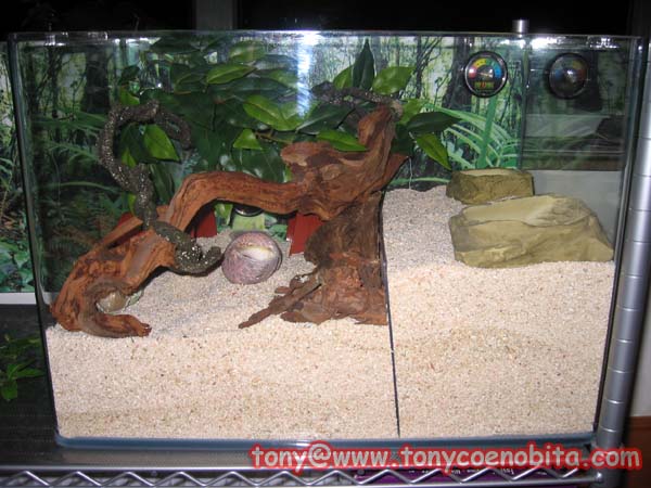 飼養缸裏左邊的是10cm厚乾沙, 右邊的是15cm厚的濕沙. 淡水盆和海水盆放在濕沙那邊是因為基於將近脫殼的陸寄居蟹住住會到較濕的沙挖掘, 找尋一個可以躲藏的地方. 所以, 基於濕沙有助牠們挖掘洞穴, 所以便把水盆放在那一邊.