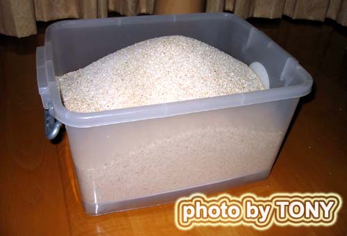 因為看到後備沙已經晒乾了, 而且細小灰白陸也脫完殼, 又將近夏天, 便決定把飼養缸清洗. 首先是把晒好的後備沙子例進大膠箱裏, 這個箱子真的很大. 我想箱子大約載了20kg的沙.