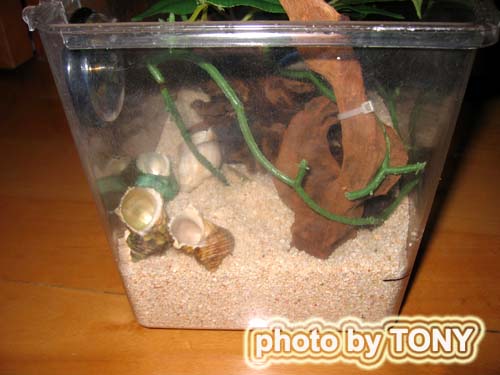 跟著便是清洗飼養缸, 把所有東西也取了出來, 放在熱水裏浸一下. 然後便開始清洗飼養缸. 飼養缸洗好了便開始重新佈置. 不過其佈置其實和以前的都一樣, 讓陸寄居蟹回去後不會感到陌生.