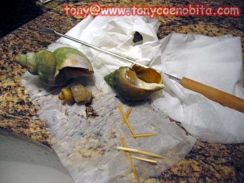 用了牙籤, 長型幼鉗子, 成功把翡翠螺的前部分(連蓋口)的身體挖了出來.