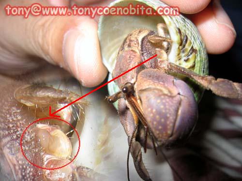 先說為何會有這隻小短腕, 其實是一位友人在06年9月中時給我寄養的. 他還給了我一隻小型的深紫陸寄居蟹. 很巧合,兩隻陸寄居蟹也是斷了一整隻胸足. 短腕斷了左邊第三胸足(下圖紅圈處), 深紫陸斷了左邊第二胸足.