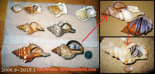 剛剛我家飼養近9年的橙紅陸寄居蟹便出現了一個例子. 1號螺殼背了3年幾, 2號螺殼放了1年幾也沒有更換.