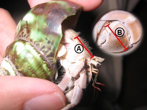 我自已測量過家中的小灰白陸寄居蟹, 前甲長是8mm, 左螯腳幅度是12mm, 比例並不是1:1. 不過這不是重點, 重點是這調查說明了前甲長和左螯腳幅度的長度是差不多的, 使我想起這會否和牠們計算空螺殼是否適合自己有關?