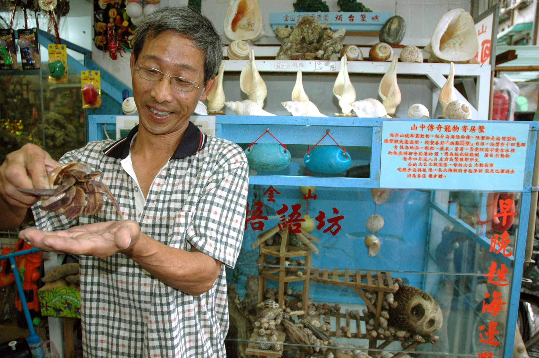 他說,當時做裝潢的他,遇到不景氣,還被倒了許多會錢,他才決心不做了,要回金山老街做生意,他開了一間內有禮品玩具的「悟語坊」,也同時開始養寄居蟹的生活,起初他養在二樓,不敢讓顧客看到。