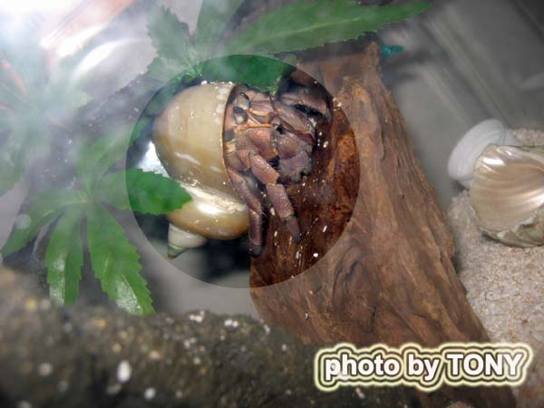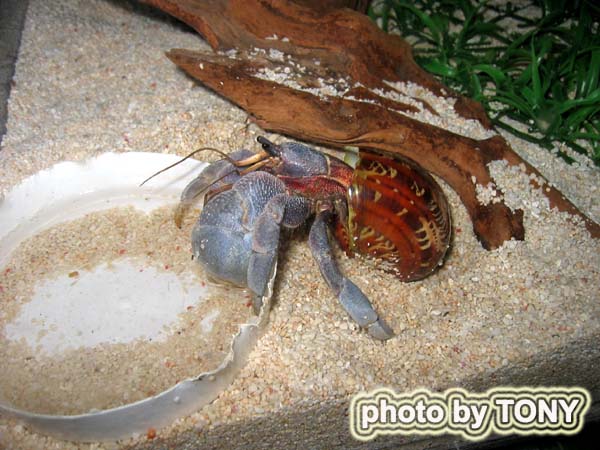 為何不養魚?他說,養魚很麻煩,要常常清洗魚缸,但養寄居蟹不用,這些寄居蟹他養了好多年,許多都是他晚上到海邊撿來的,因為牠們是夜行性動物,因此,要用探照燈來照,他們拿出自己的法寶說,要用米糠引誘牠們,最後再一舉成擒,養了七、八年的寄居蟹已有二十多隻,體積也變得很大。