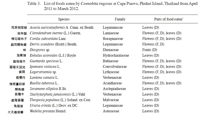 以下的植物資料是出自一篇研究泰國野外灰白陸寄居蟹(Coenobita rugosus)的文獻, 大家可參考一下.